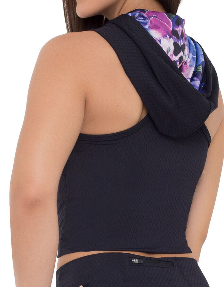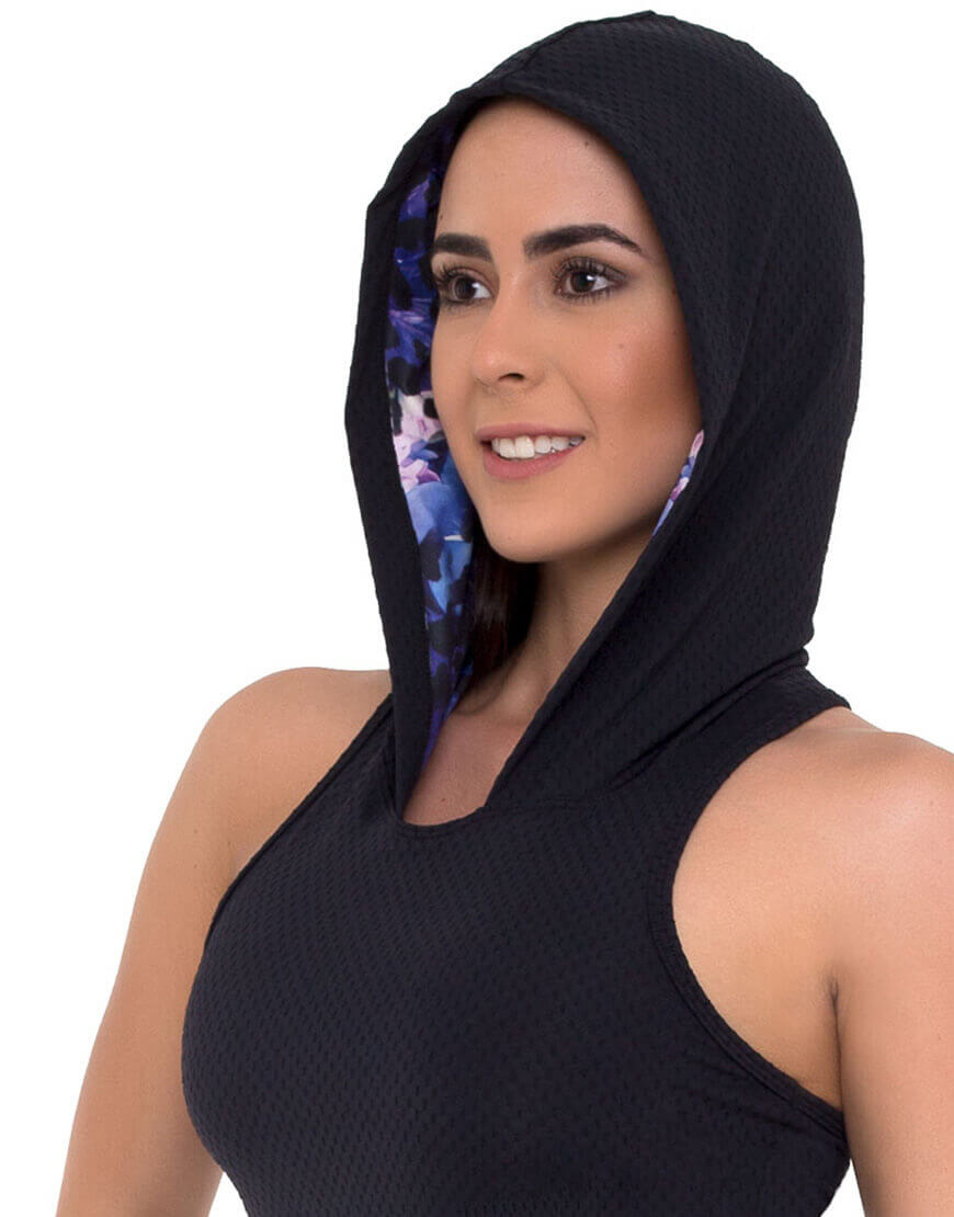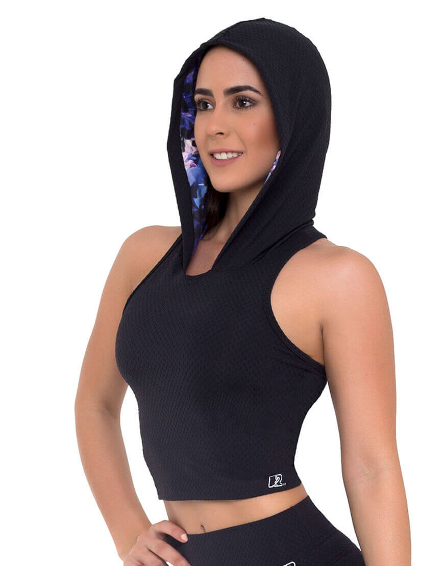 “Top tank hoddie con top interno y refuerzo elástico para comodidad de la usuaria al realizar ejercicio tanto de alto impacto, de movimiento o estiramiento. Prenda con forro sublimado para coordinar “